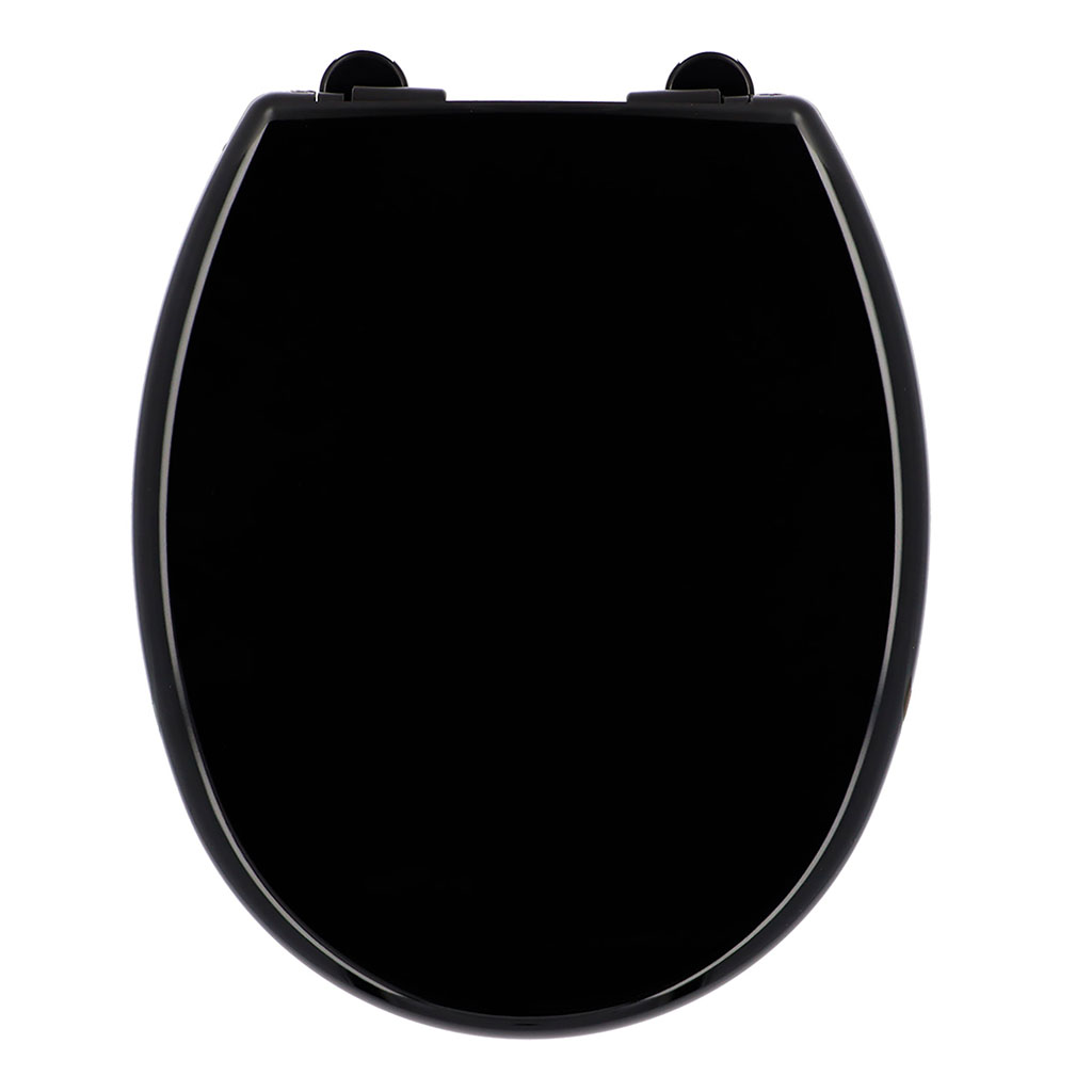 Cet abattant de toilette noir, équipé de fixations en plastique, s’adapte parfaitement à tous types de WC.