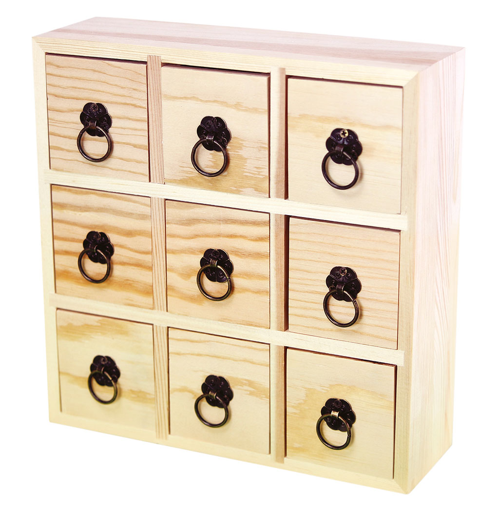 Cette boite de rangement 9 tiroirs en bois brut vous permettra de ranger vos petits objets du quotidien.