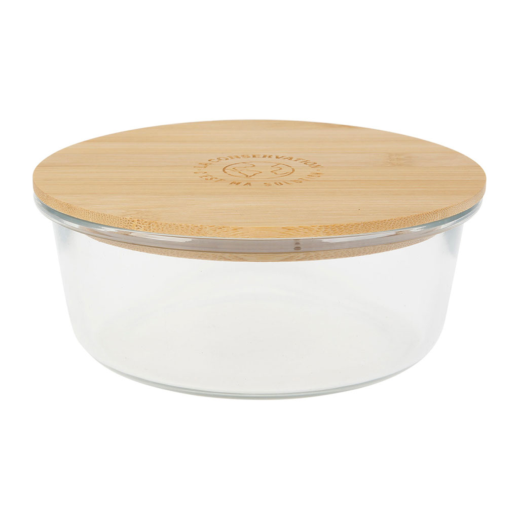 Cette boite alimentaire ronde en verre et son couvercle en bambou sera parfaite pour stocker vos aliments secs ou vos plats au réfrigérateur.