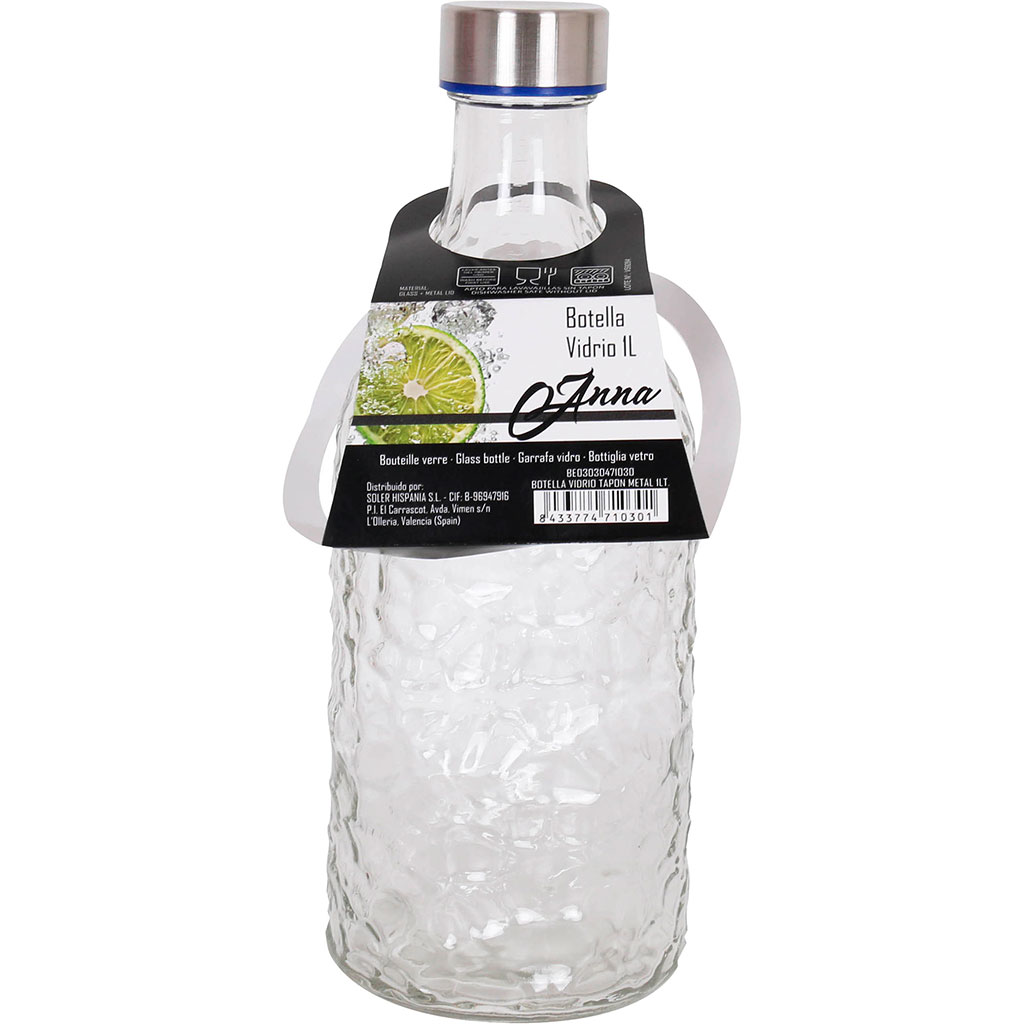 D'une contenance de 1 litre, cette bouteille en verre pourra être utilisée comme carafe.