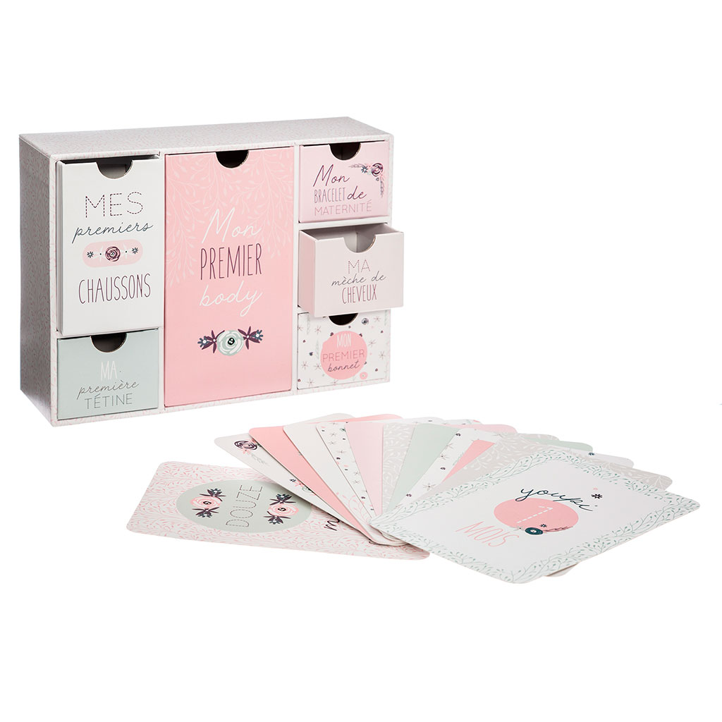 Ce joli coffret de naissance s'accompagne de 12 cartes de 1 à 12 mois qui permettront de conserver tous les souvenirs de bébé.