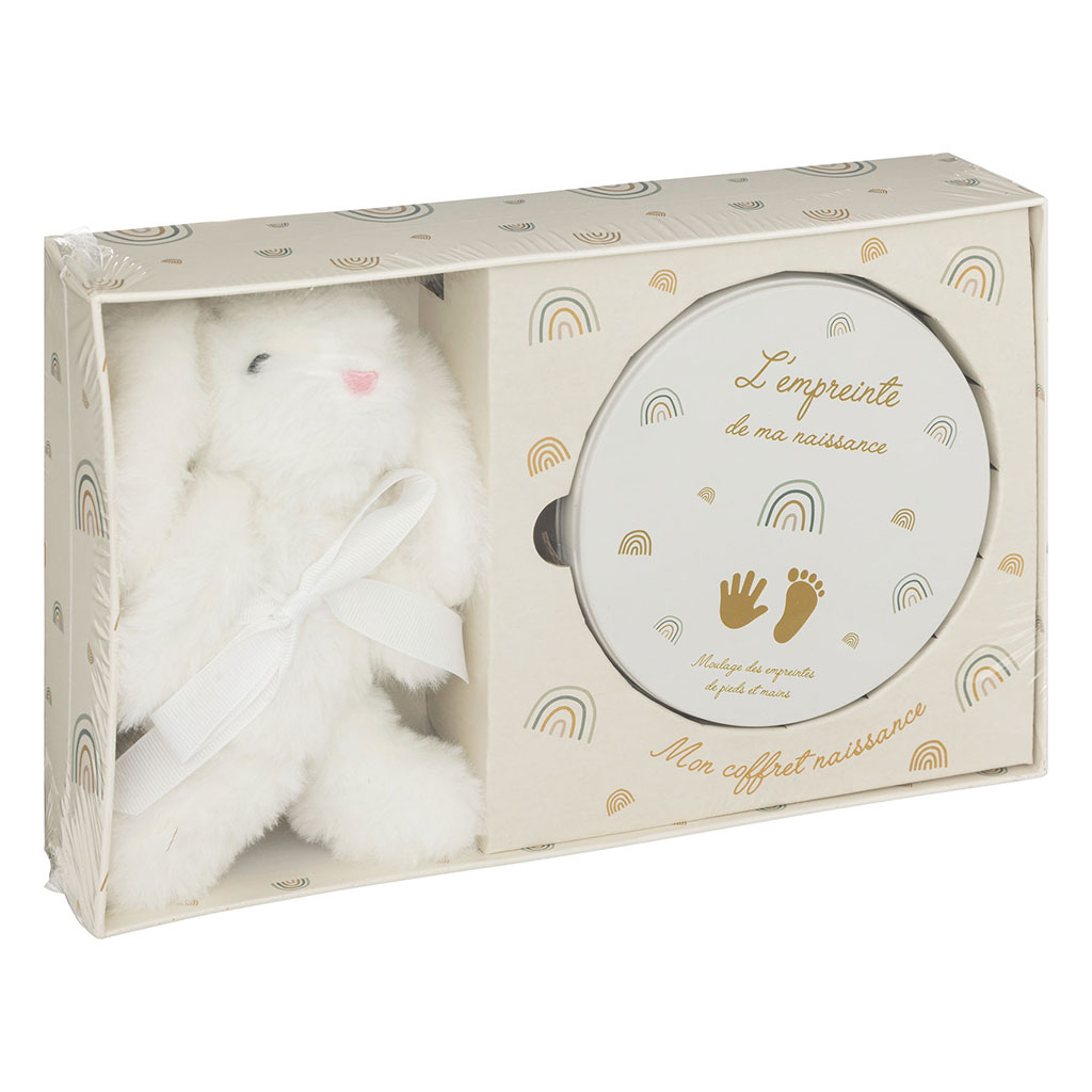 Ce coffret se compose d'une peluche en forme de lapin et d'un set pour mouler les empreinte de votre enfant.