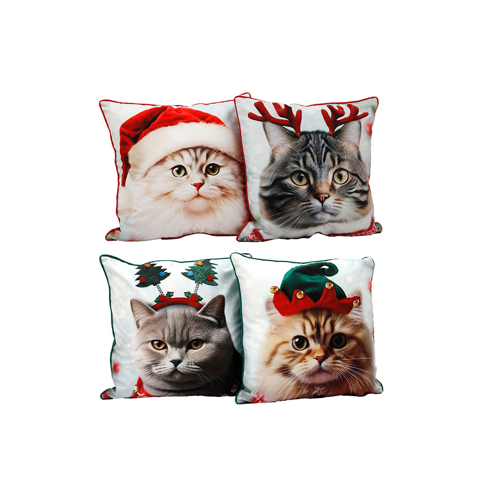 Apportez une touche de douceur et de fantaisie à votre déco avec ce coussin carré en polyester motif chat de Noël !