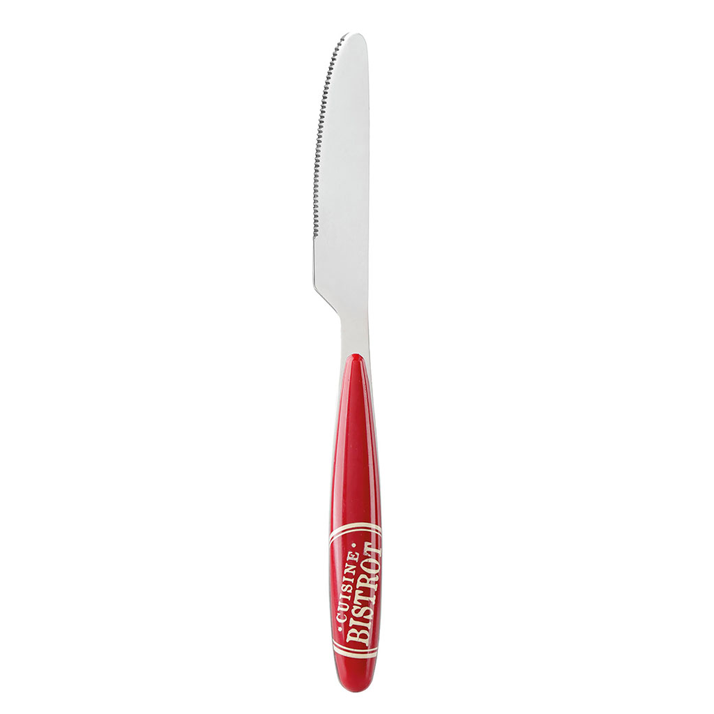 Ce couteau de table dispose d'une lame arrondie crantée et d'un manche rouge avec inscription.