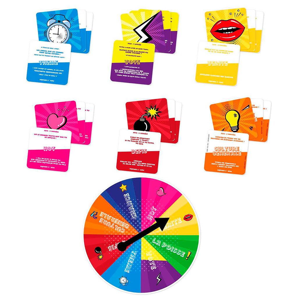 Ce jeu contient 60 cartes, 1 roulette et 2 verres à shots.
