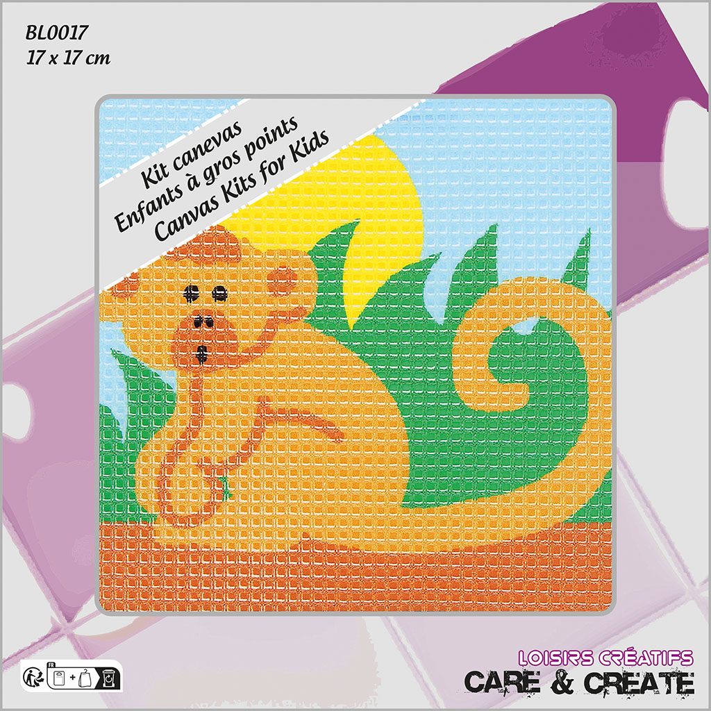 Le kit contient 1 toile imprimé, 1 aiguille en plastique à bout rond, des fils de laine et 1 guide d'instruction.