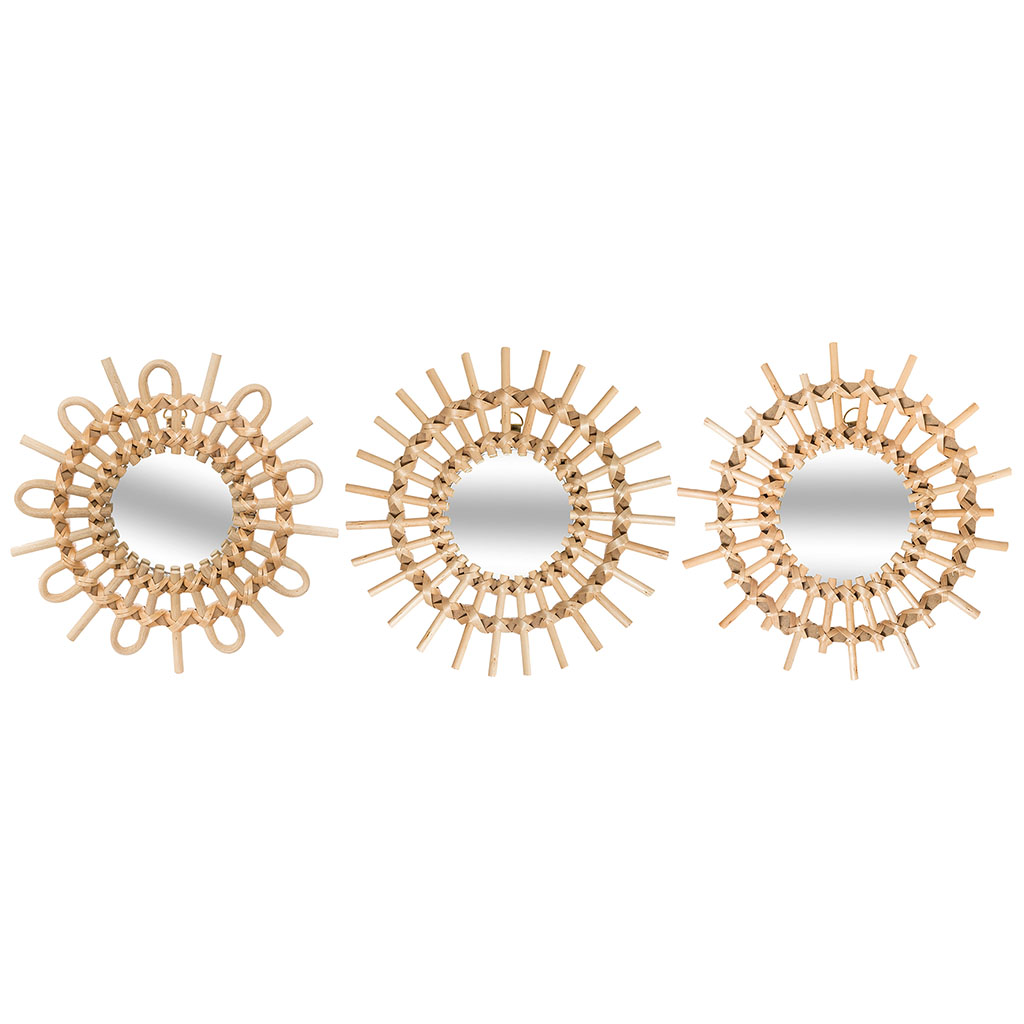 Cette composition de 3 miroirs en rotin de différentes formes sera idéale pour habiller un mur, dans votre entrée, salon ou comme tête de lit, pour une décoration originale et avec style.