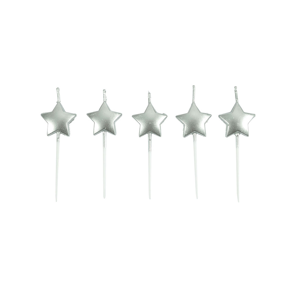 Pour une décoration de gâteau d'anniversaire réussie, ce lot de 5 bougies en forme d'étoiles argentées est indispensable!