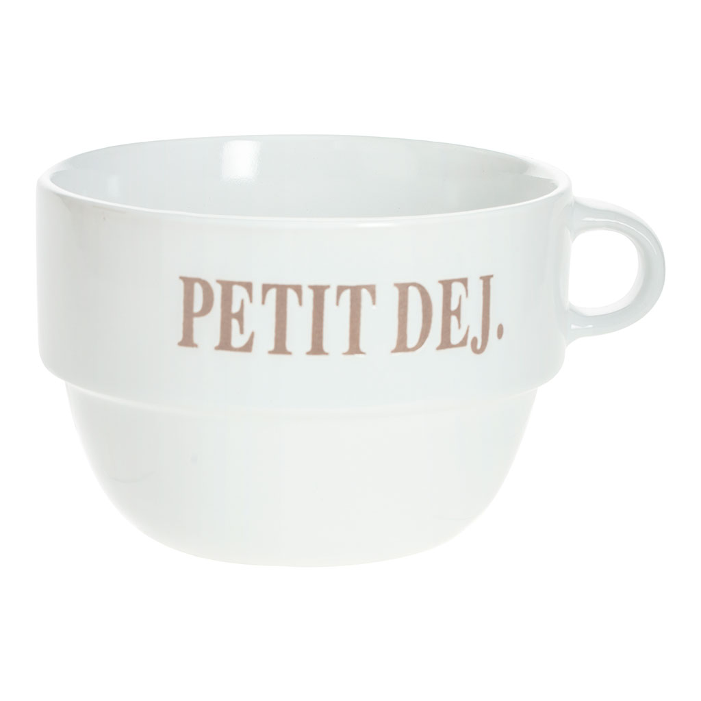 Un joli mug blanc avec anse et inscription Petit DEJ, parfait pour savourer sa boisson chaude préférée le matin !