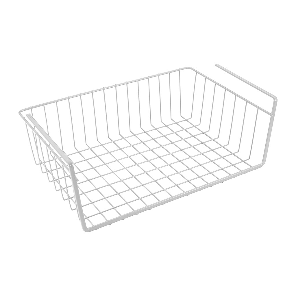 Ce panier blanc à suspendre s'accrochera simplement à une tablette d'étagère.