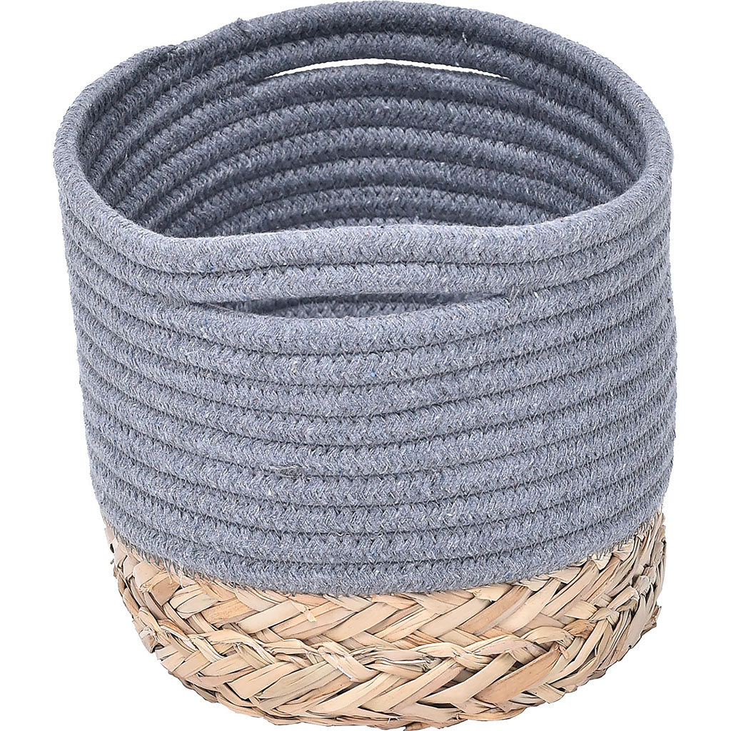 Un joli panier bi-matière en coton gris et matière végétale, parfait pour ranger vos accessoires du quotidien.