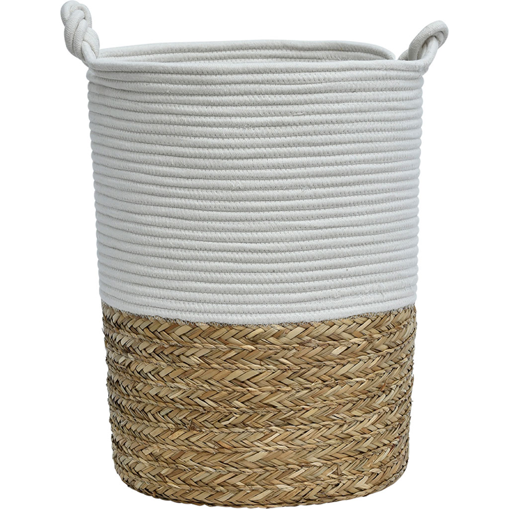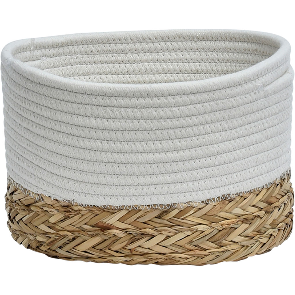 Panier ovale bimatière roseau tressé et coton blan...