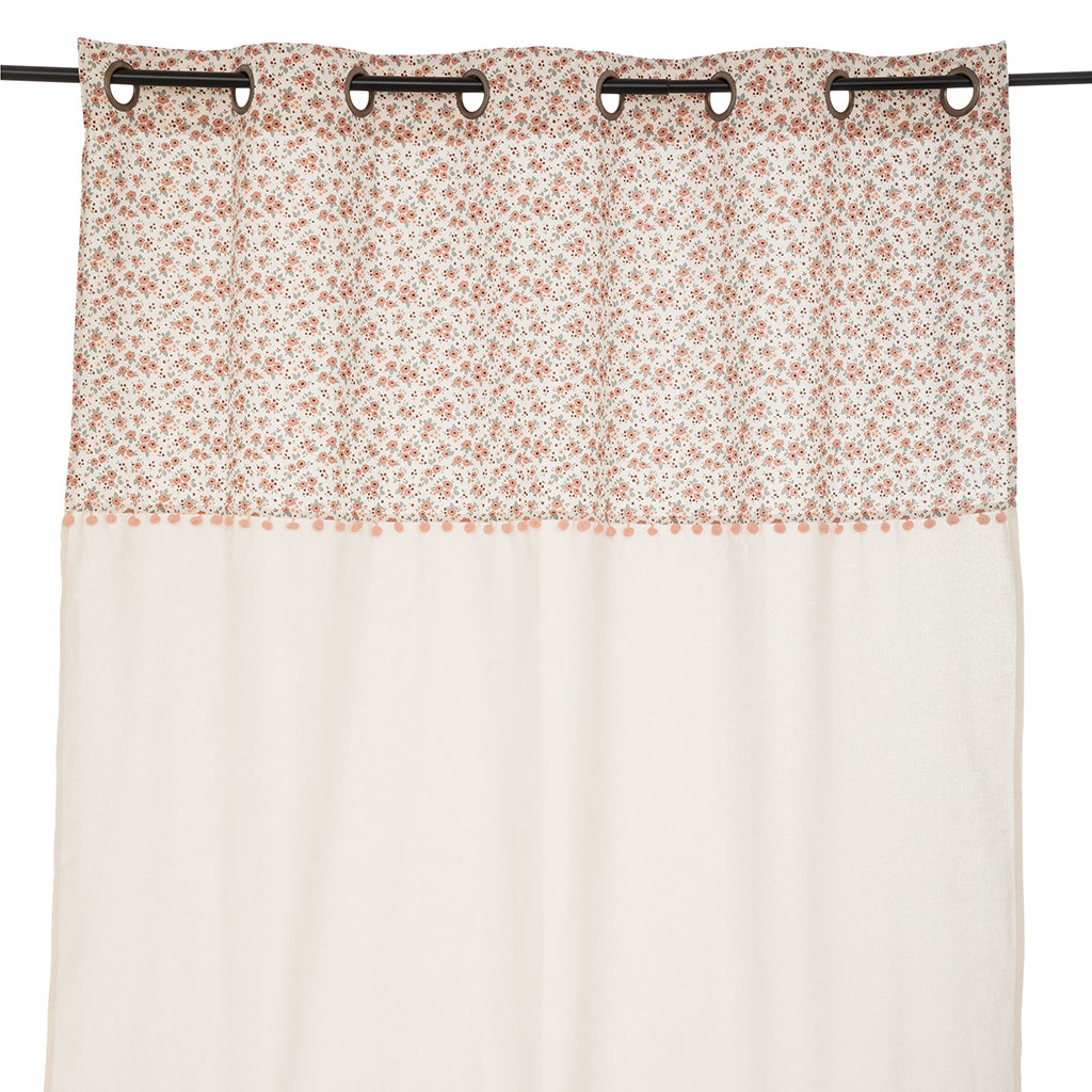 Ce joli rideau sur le thème campagne dispose d'un imprimé fleuri sur le haut et de petits pompons.