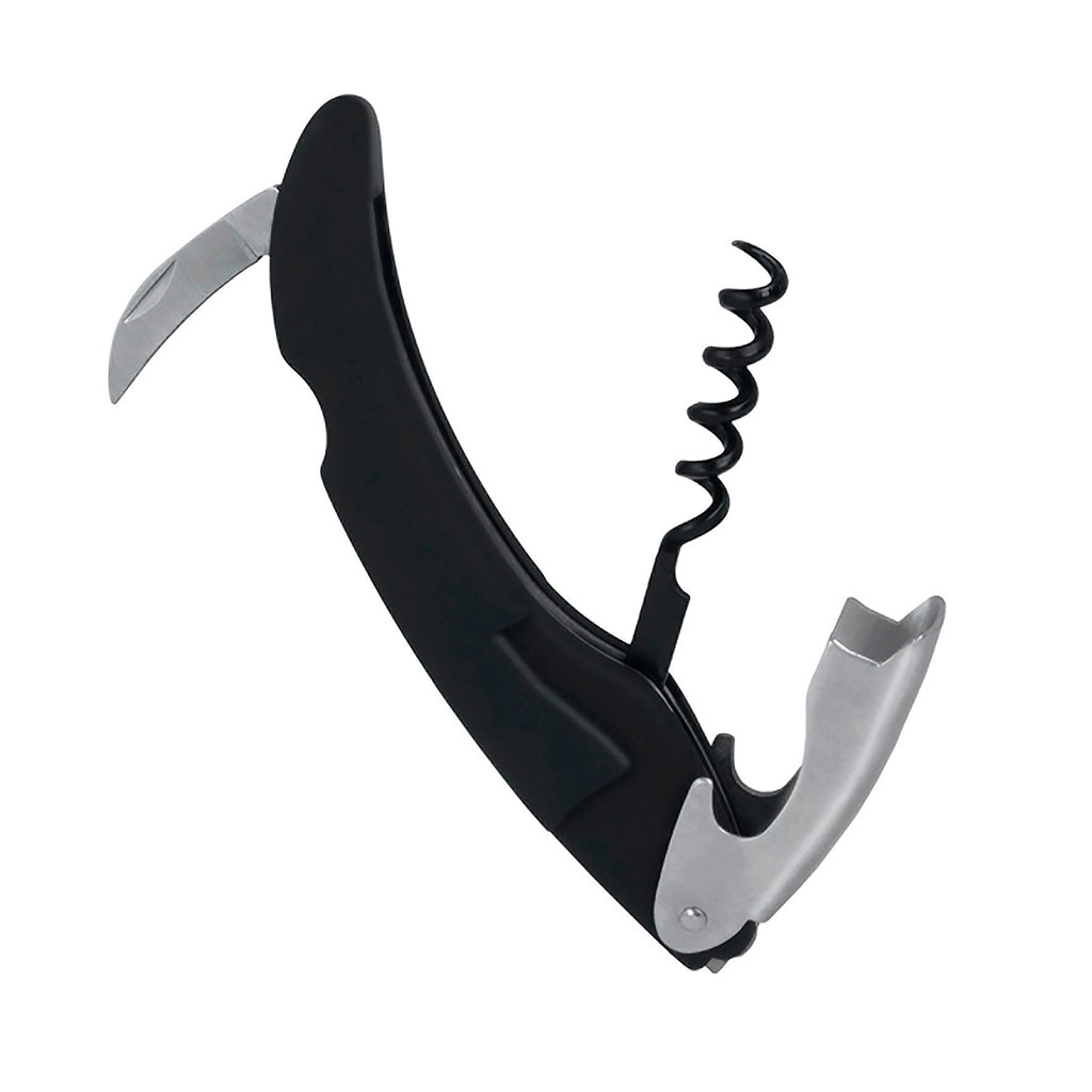 Il dispose d'une petite lame dentelée, d'une tire-bouchon et d'un décapsuleur.