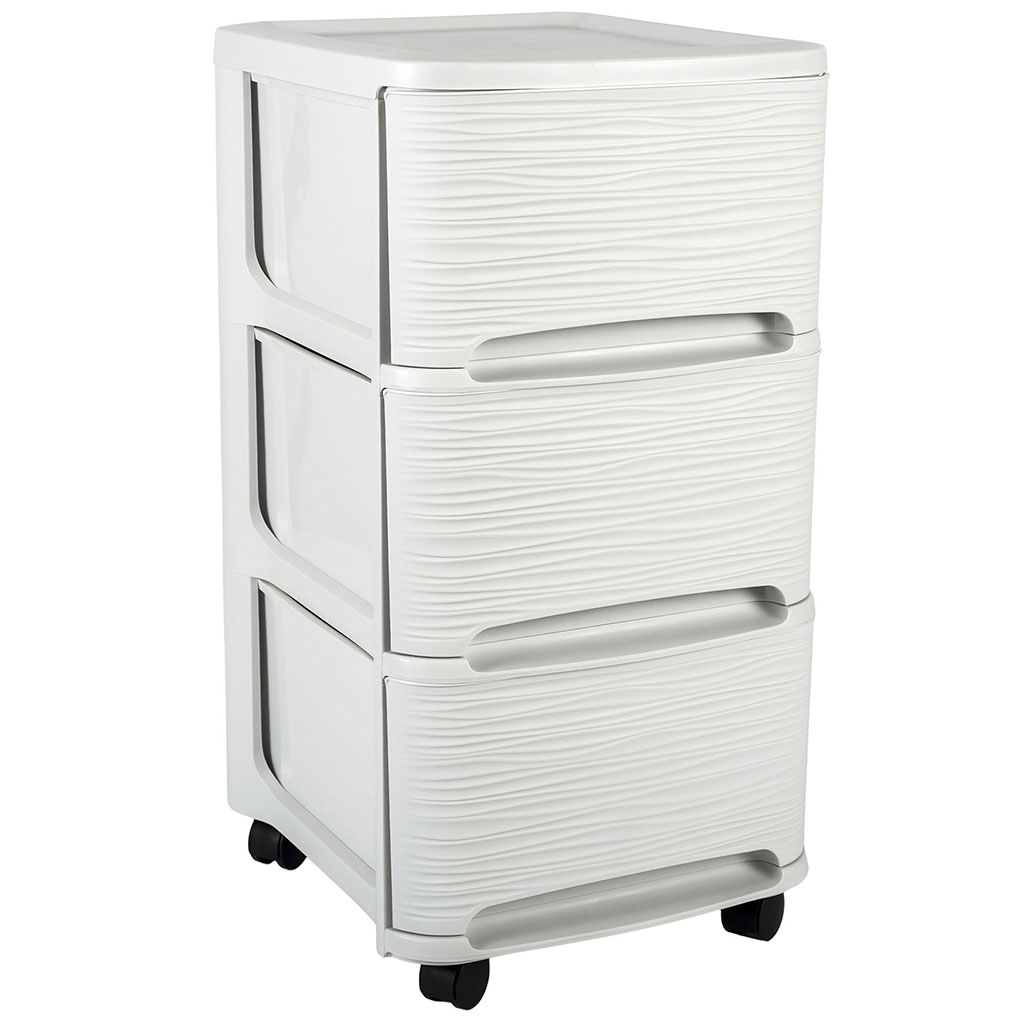 Rangez vos documents grâce à cette tour de rangement composée de 3 tiroirs. Son effet "vagues" sur le devant apportera une touche moderne à votre déco. Cette tour se déplace facilement grâce à ses roulettes. Fabrication française